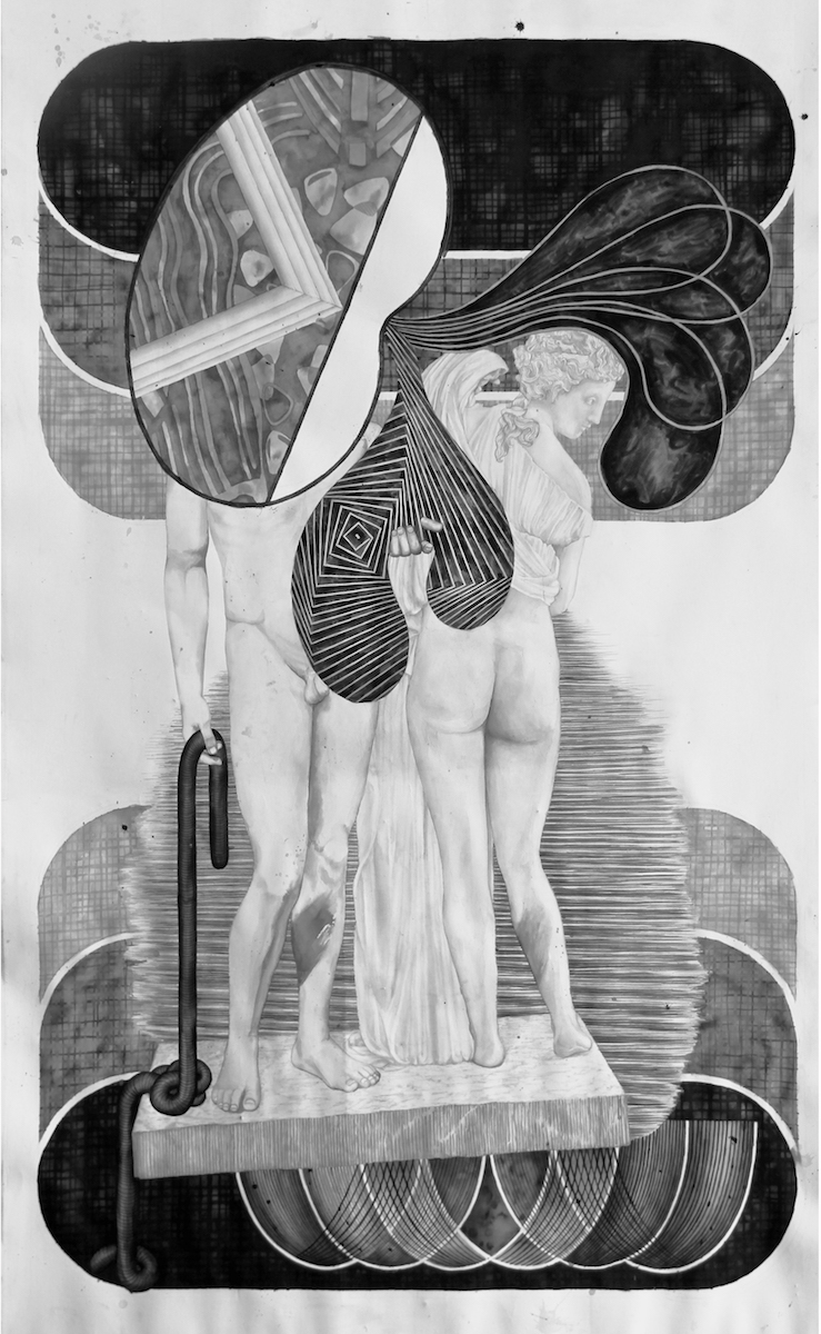 Thus Liu presents her series Master O-Note, that draws from Ootje Oxenaar’s currency designs to create a ”zero-value” note, which citizens convert their shit for, and thereby set the stage for the re-enactment of capitalism. Several other large scale ink drawings in the exhibition imagine the thinking, priorities and aesthetics of this society. They are as visually transitional as the society itself – a multitude of sources and styles work with and against each other, unified only by material.